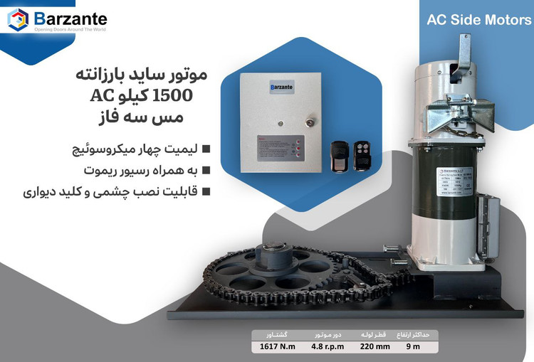 با گشتاور 1617 نیوتن متر و قطر لوله 220 میلیمتر، موتور ساید 1500 کیلوگرم AC بارزانته سه فاز بهخوبی برای کنترل کرکرههای برقی با حداکثر ارتفاع 9 متر مجهز است. میتوان آن را بهراحتی از طریق یک ریموت کد لرن با فرکانس 433 کنترل کرد. بعلاوه انعطافپذیری را برای نصب چشم خطی و فلاشر برای عملکرد بهتر ارائه میدهد.