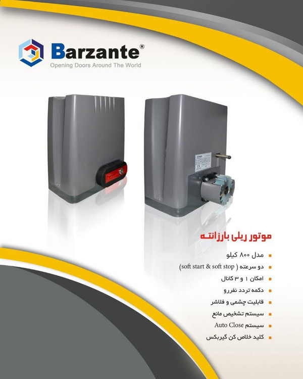 موتور درب ریلی بارزانته ۸۰۰ کیلو دو سرعته (soft start & soft stop) امکان ۱ و ۳ کانال دکمه تردد نفر و قابلیت چشمی و فلاشر سیستم تشخیص مانع سیستم auto close