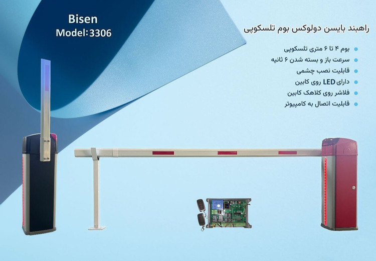 راهبند بایسن بوم تلسکوپی بوم ۴ تا ۶ متری تلسکوپی قابلیت نصب چشمی سرعت باز و بسته شدن ۶ ثانیه دارای LED روی کابین فلاشر روی کلاهک کابین قابلیت اتصال به کامپیوتر