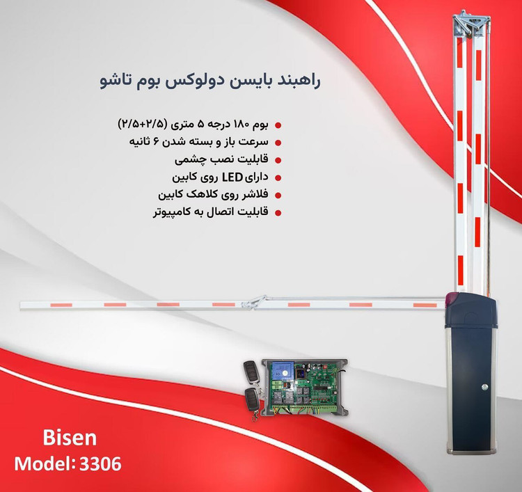 راهبند بایسن بوم ۱۸۰ درجه۵ متری (۲/۵ + ۲/۵) فلاشر روی کلاهک کابین سرعت باز و بسته شدن ۶ ثانیه قابلیت اتصال به کامپیوتر دارای ال ای دی روی کابین