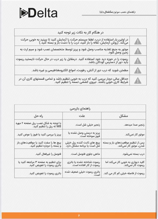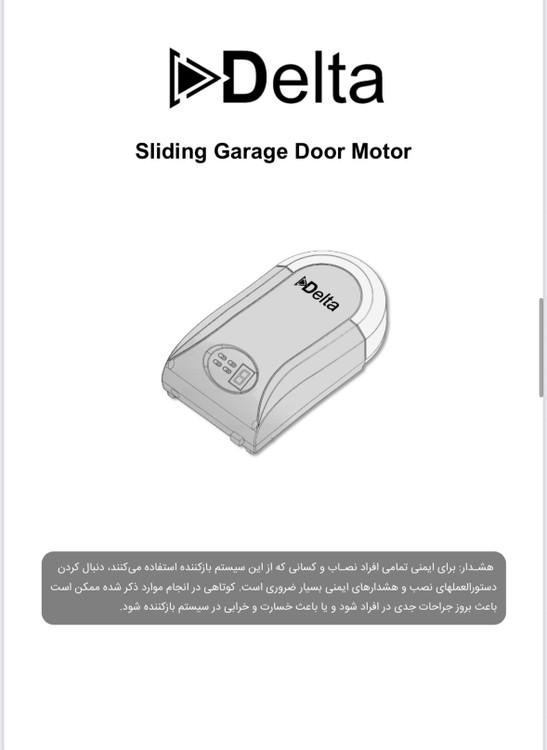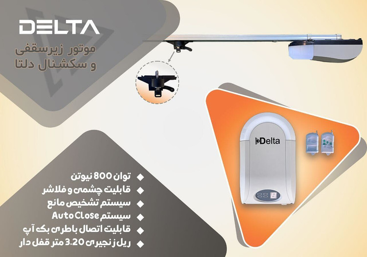 موتور زیر سقفی و سکشنال دلتا توان ۸۰۰ نیوتون قابلیت چشمی و فلاشر سیستم تشخیص مانع سیستم اتو کلوز قابلیت اتصال باطری بک آپ ریل زنجیری ۳.۲۰ متر قفل دار ریل زنجیری ۴.۳۰ متر قفل دار