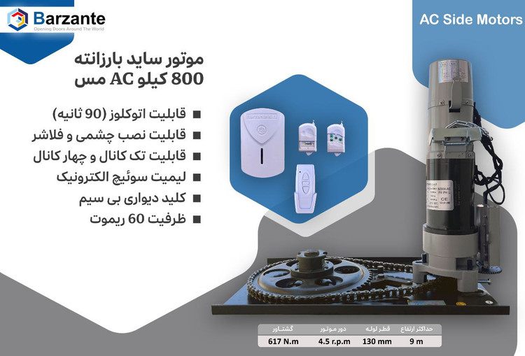 موتور ساید 800 کیلوگرم AC بارزانته (سیم پیچ مس) علاوه بر عملکردهای اصلی خود، ویژگیهای اضافی برای ایمنی و راحتی ارائه میدهد، ازجمله قابلیت نصب چشم خطی برای افزایش امنیت و نصب فلاشر برای دریافت هشدارهای بصری. سیستم خلاصکن زنجیری تضمین میکند که در مواقع اضطراری مانند قطع برق، میتوان بهصورت دستی با درب کار کرد.